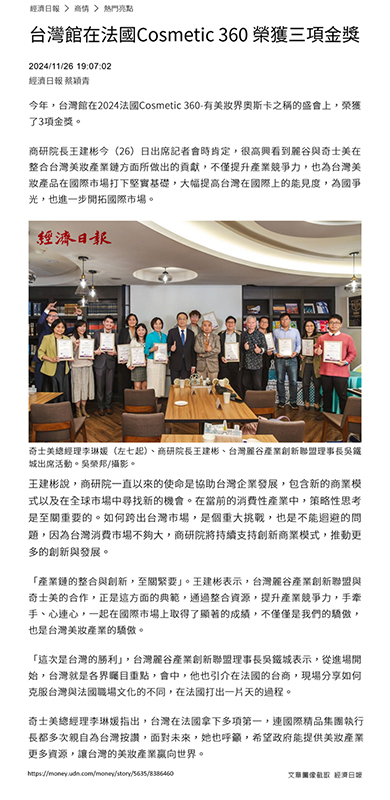 美妝界的奧斯卡-法國Cosmetic 360 台灣館榮獲三項金獎